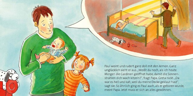 Paul ist winzig klein und ziemlich knitterig. Seitdem er da ist, kümmern sich Mama oder Papa die ganze Zeit um ihn. Seine Schwester Greta wundert sich. Warum wird Paul an Papas Bauch gequetscht getragen? Weshal