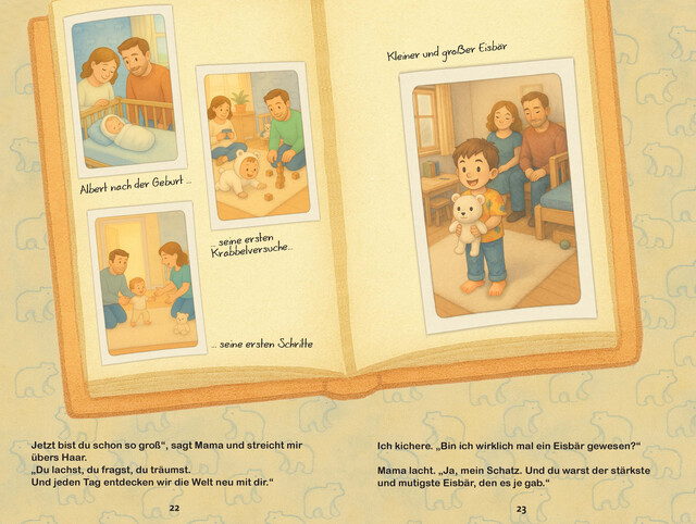 „Wie bin ich eigentlich entstanden?“, fragt der kleine Albert seine Mama. „Bevor du in meinen Bauch kamst, warst du ein kleiner Eisbär.“ Mit dieser liebevollen Metapher beginnt eine besondere Reise durch die Kinderwunschzeit, denn Albert wurde mithilfe von künstlicher Befruchtung gezeugt. In ruhigen Worten und kindgerechten Bildern lernen Kinder, was In-vitro-Fertilisation (IVF) und Intrazytoplasmatische Spermieninjektion (ICSI) bedeuten – ohne Angst, ohne Scham, dafür mit ganz viel Wärme.